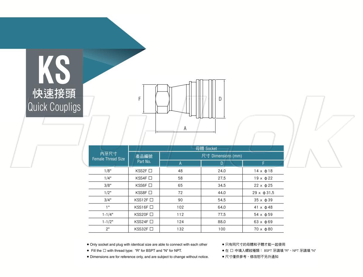 1.内牙接口型式,尺寸范围1/4" ~ 2"